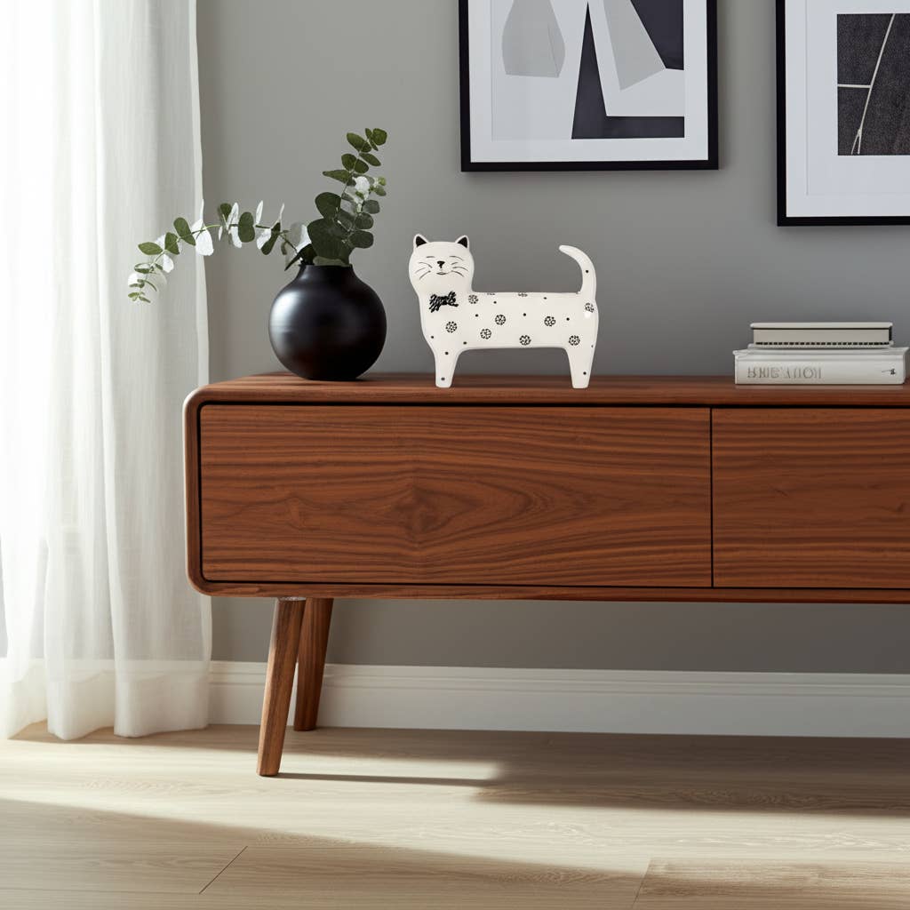 • PREMIUM QUALITY MATERIALS - Crafted from high-quality stoneware, ceramic, and suar wood, this cat figurine offers durability combined with an artistic appeal, making it a timeless decorative piece for any space.