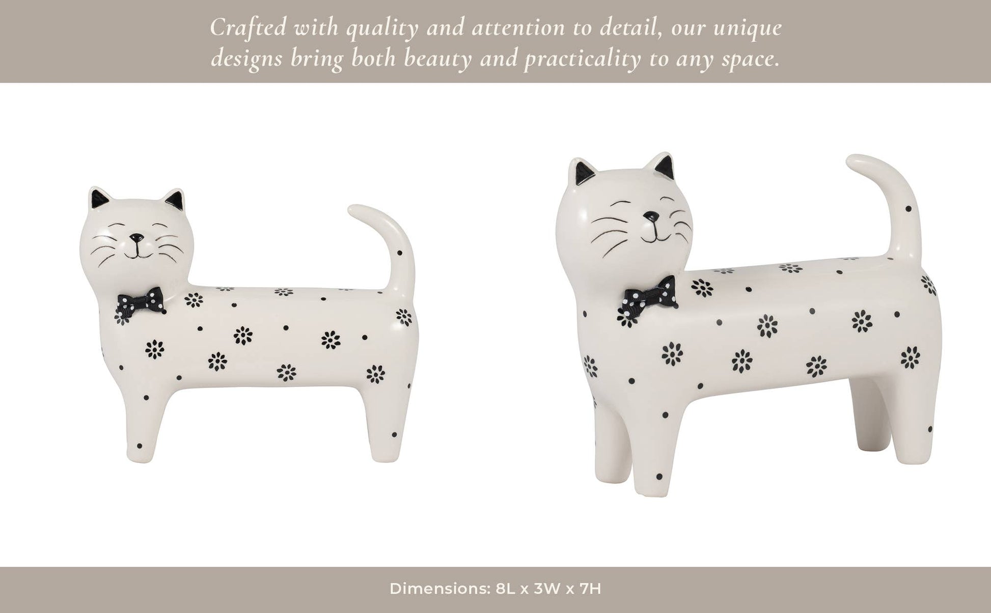 • ELEGANT MODERN DESIGN - This decorative cat figurine features a sleek white finish with delicate floral patterns and a charming black bow tie, adding a sophisticated touch to any modern home, office, bedroom, or living room decor.