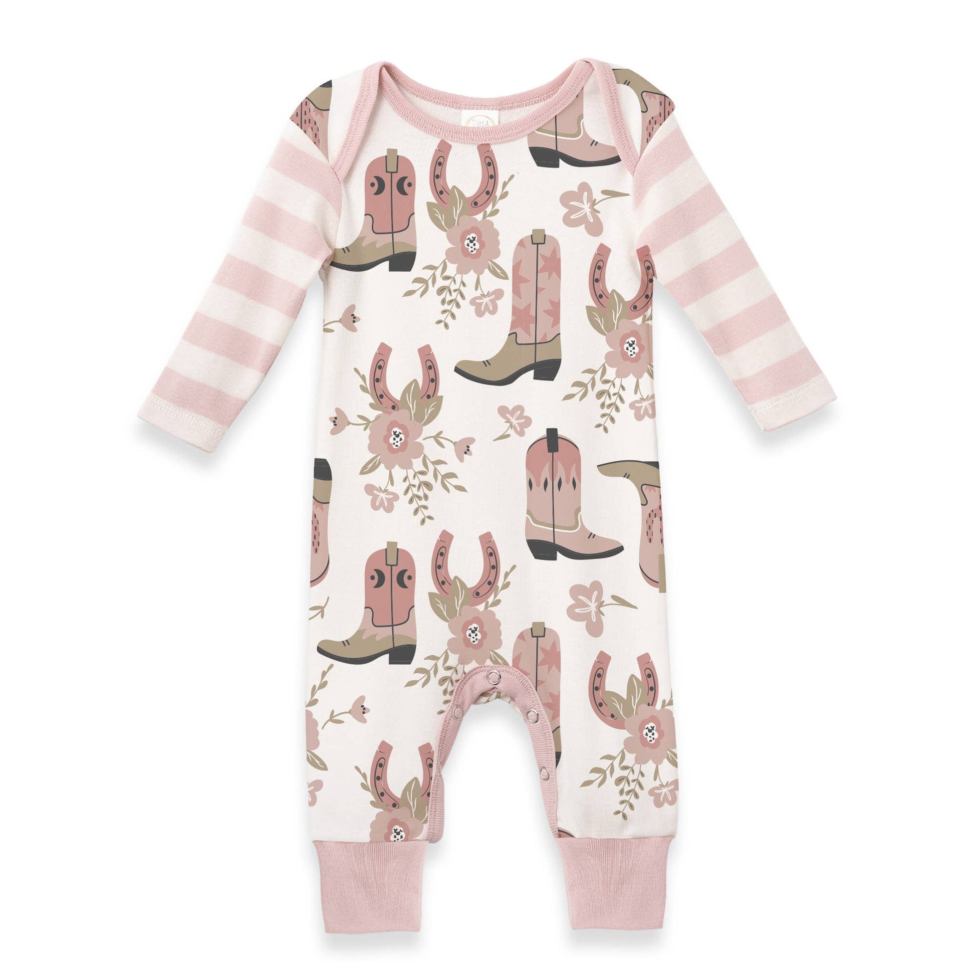Made from breathable, hypoallergenic cotton rib with an allover cowgirl boots print and soft striped sleeves. Features an envelope neckline and snaps underneath for quick, easy changes.
