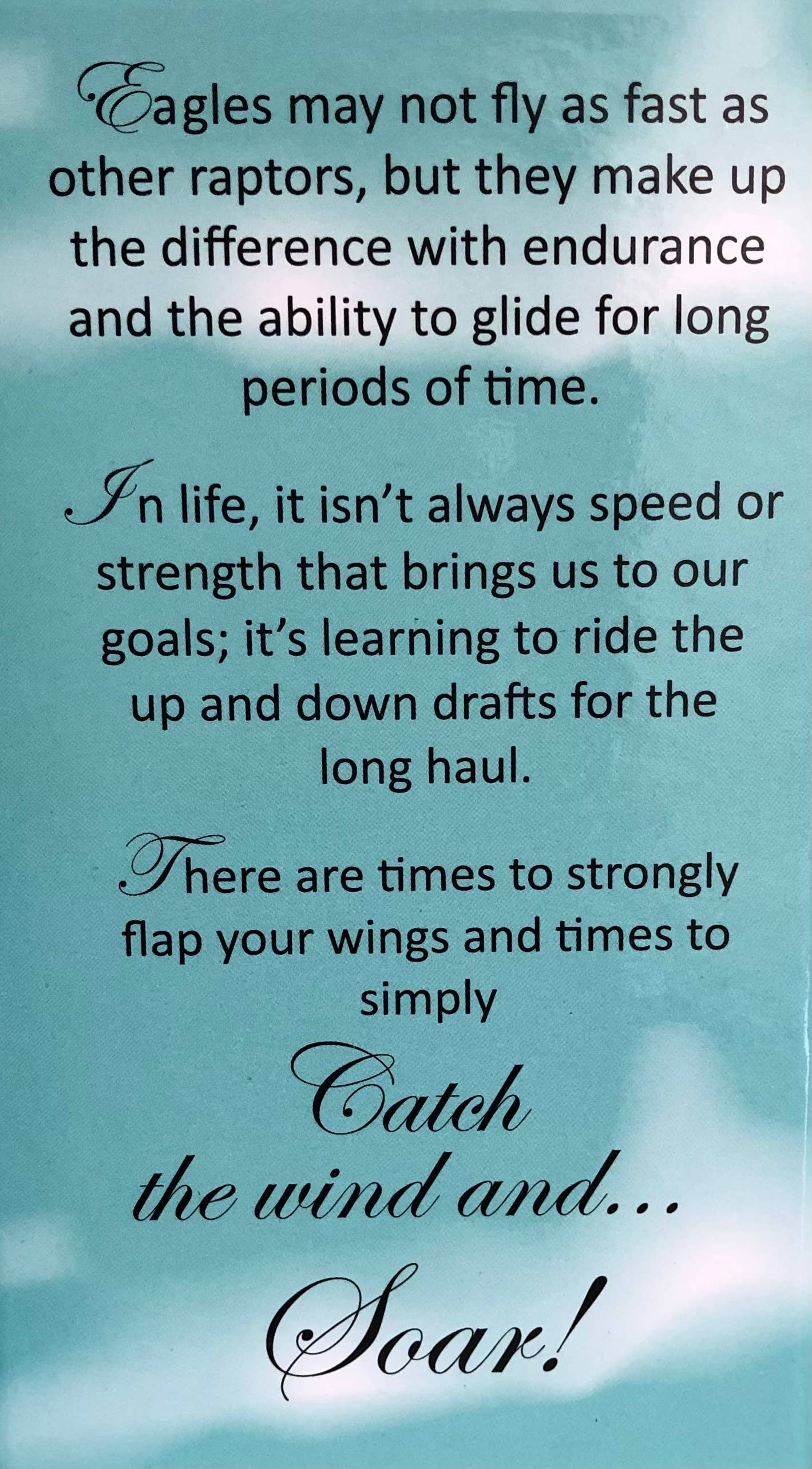 Eagle feather Necklace, featuring silver and grey tones, accented with white cubic zirconias. The beautiful, keepsake box opens up to display a verse with the tagline, “Catch the wind and soar”.