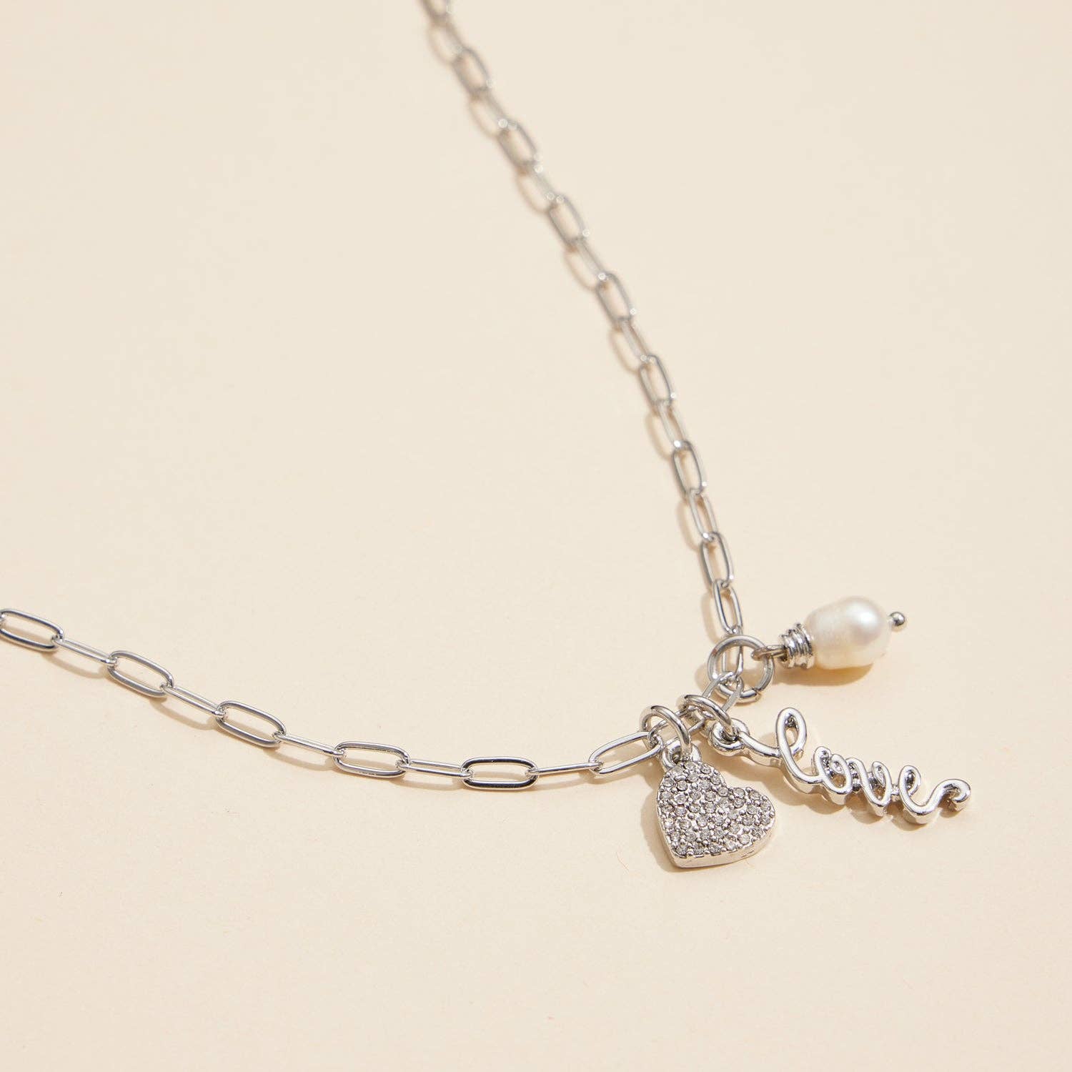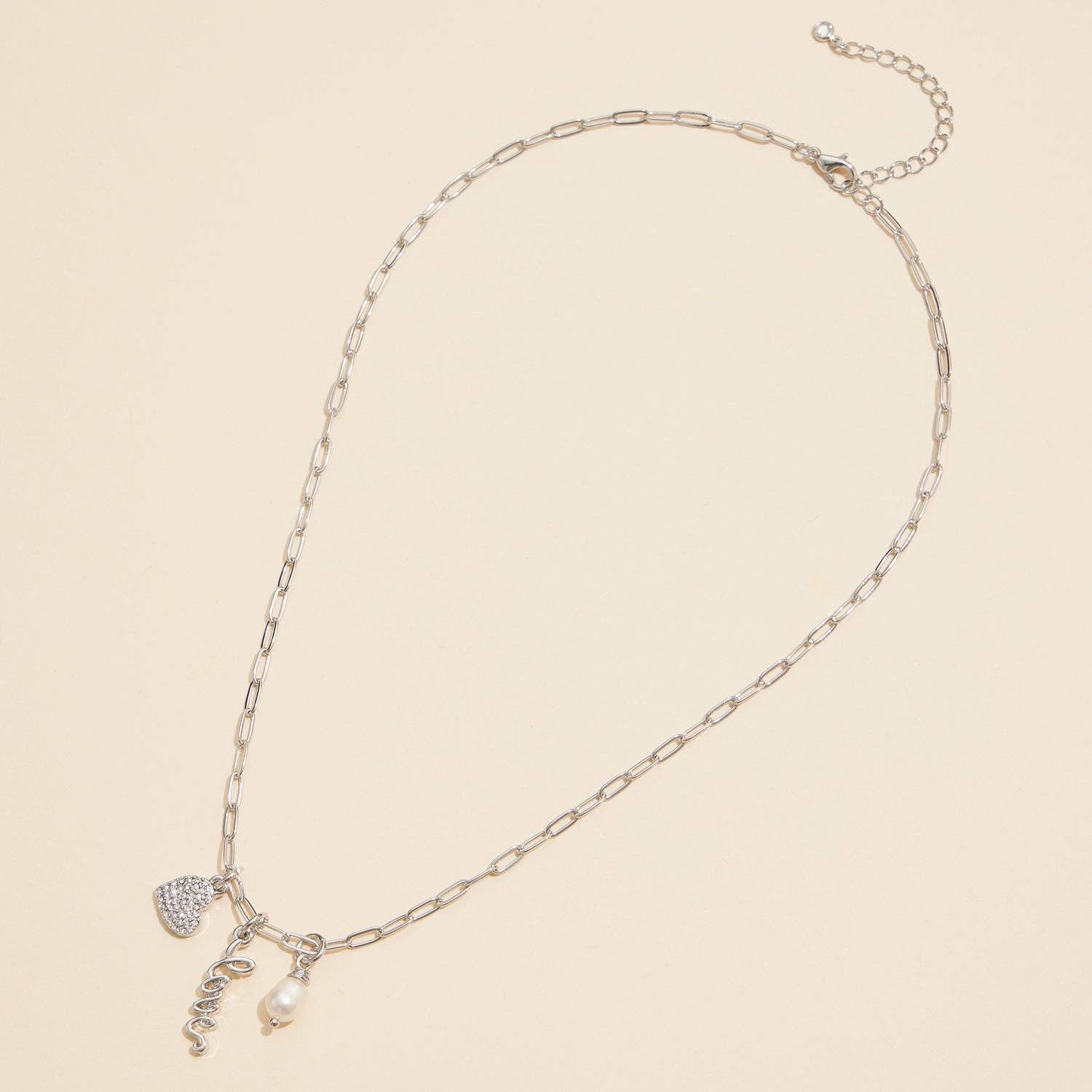 Delight in the delicate charm of this exquisite "Love" pendant necklace. Featuring a dainty script "Love" charm, a sparkling heart pendant, and a lustrous pearl accent, this necklace beautifully symbolizes affection. Available in two finishes, white gold and gold, it's the perfect accessory to elevate any outfit, whether for a casual day out or a special occasion. The versatile chain and intricate details make this necklace a thoughtful gift or a personal statement piece.
