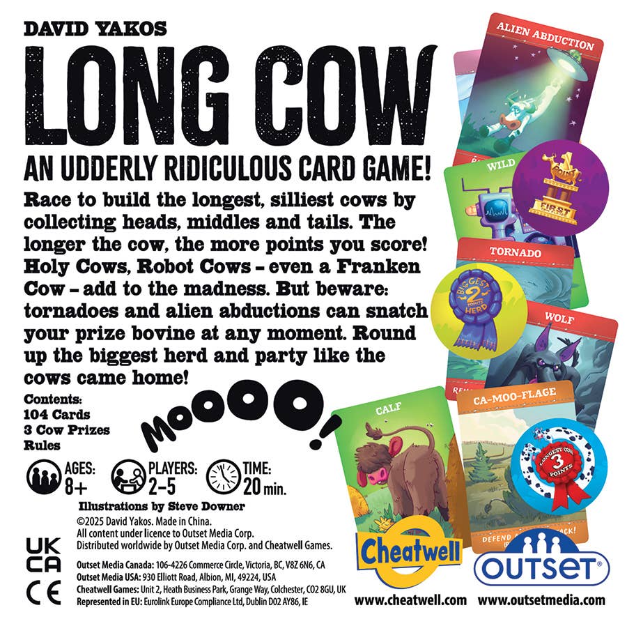 Mix and match heads, middles, and tails to create Holy Cows, Robot Cows, Franken Cows, and more. But watch out—tornadoes and alien abductions might scatter your herd! The longer your cow, the bigger your score. Stretch your creativity, outgrow your opponents, and claim the coveted Longest Cow Prize.